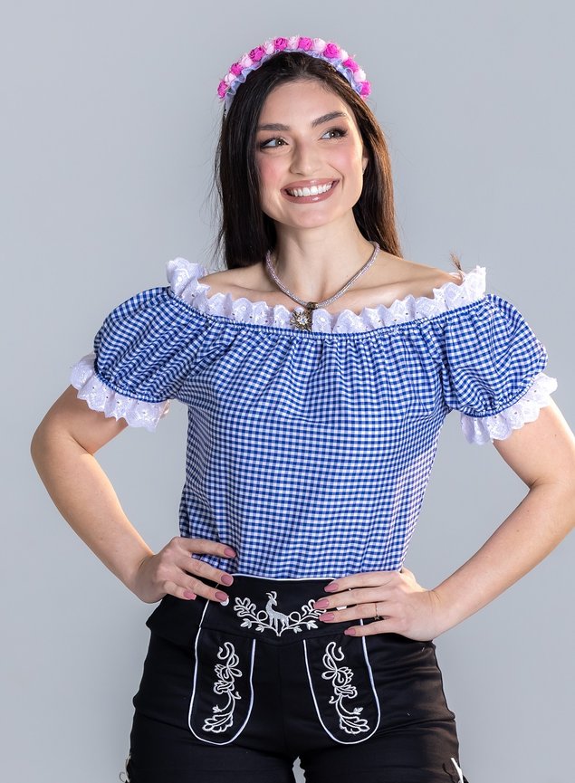👚 É confeccionada em tricoline, modelo ciganinha com acabamento em Bordado Ingles.