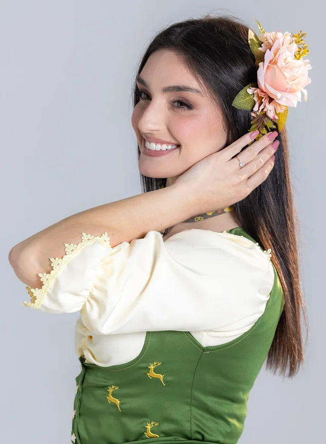 - De olho na maior festa alemã das Américas, a Alluare Trajes apresenta mais um acessório delicado e cheio de charme: o pente presilha com flores cor pêssego.