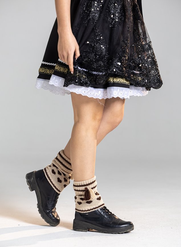 🤎 Esta polaina bege de tricot exclusiva com desenhos de corações marrons irá completar o seu traje.
