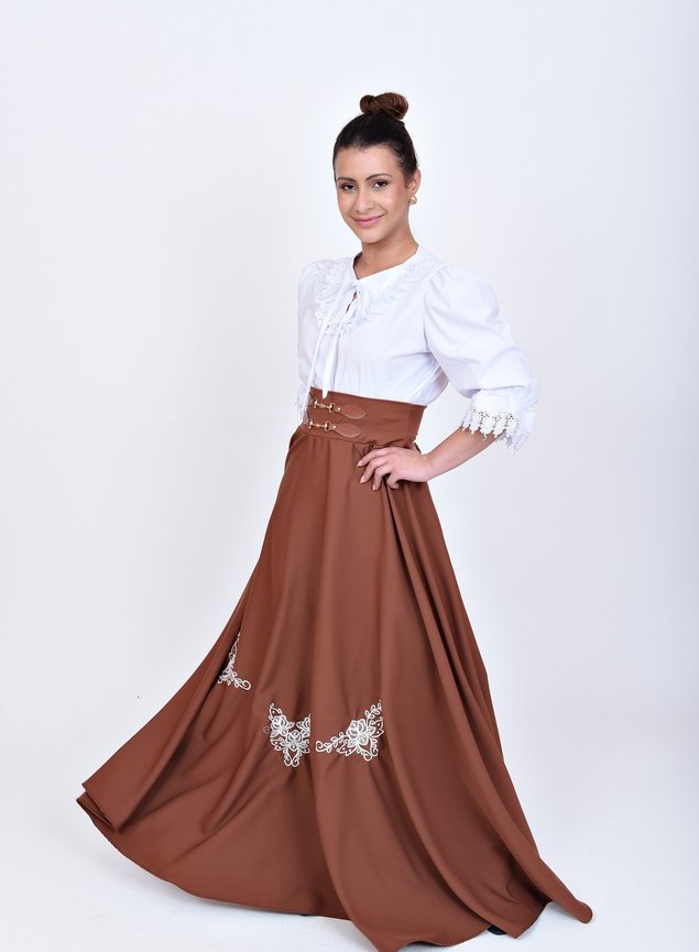 O destaque fica por conta dos bordados frontais, aplicados de forma estratégica para dar movimento visual e enriquecer a peça sem exageros. É uma saia versátil, refinada e pronta para compor produções impecáveis.