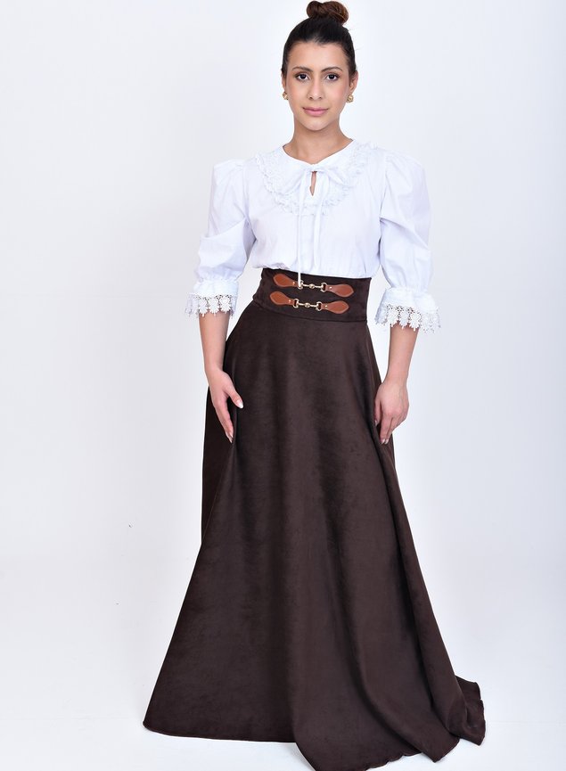 A cintura alta valoriza a silhueta, enquanto os detalhes decorativos frontais trazem charme e autenticidade ao look. Finalizada com zíper nas costas para vestir com facilidade e garantir ajuste impecável.