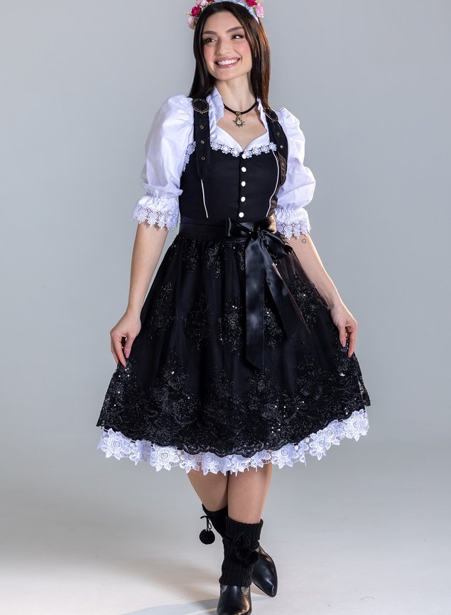 🖤 Dirndl Marlene – Sofisticação Clássica em Preto e Branco com Toque Luxuoso ✨🌸