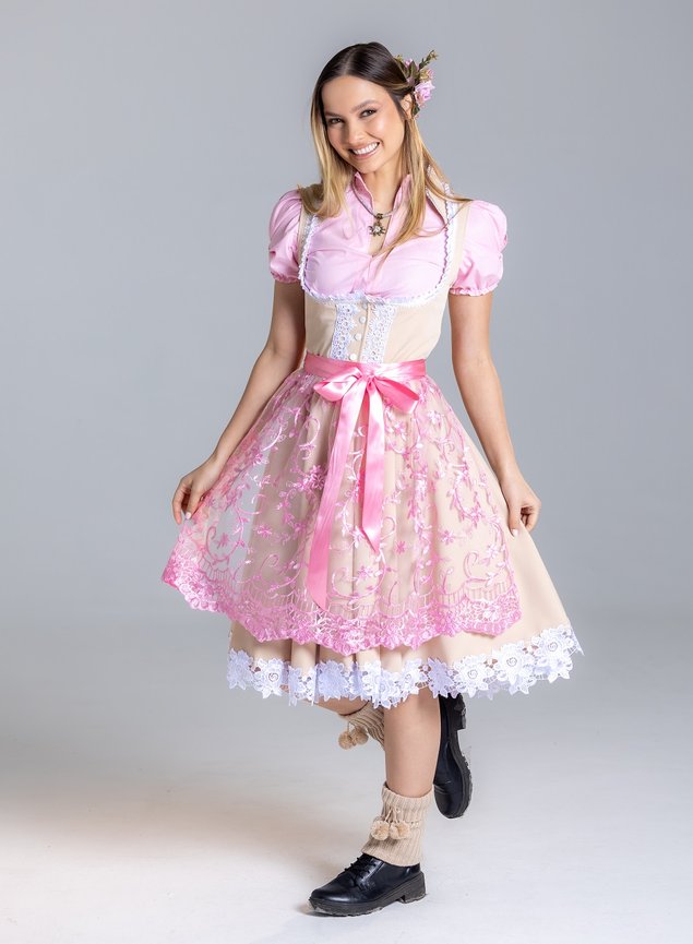 O Dirndl Liesel é a escolha perfeita para quem busca um look típico com leveza e romantismo. Em uma combinação encantadora de bege com rosa claro, essa peça é ideal para iluminar festas tradicionais com um visual delicado e autêntico.