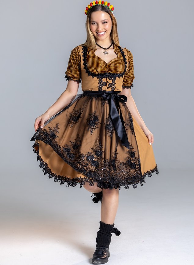 O Dirndl Isolde é um modelo que une força e feminilidade com equilíbrio perfeito. A combinação do dourado mostarda com o preto cria um visual marcante, ideal para mulheres que desejam um traje típico com personalidade e elegância atemporal.