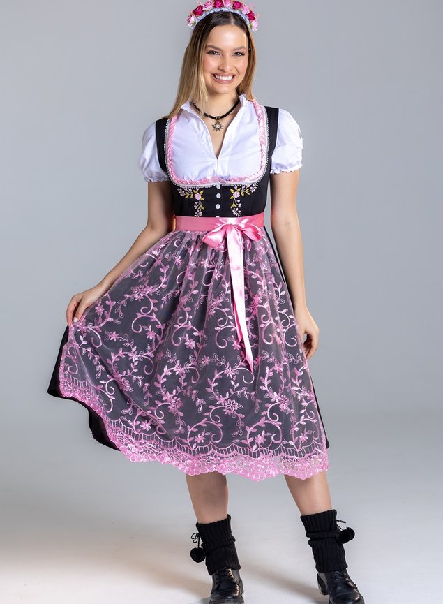 O Dirndl Amalia é uma celebração da feminilidade e da tradição alemã, com um toque de romantismo moderno. A combinação do preto com os detalhes em rosa entrega um visual delicado e, ao mesmo tempo, impactante — perfeito para mulheres que desejam se destacar com elegância nas festas típicas.