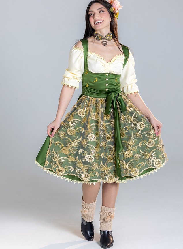 O Dirndl Gertrud é a escolha ideal para mulheres que querem transmitir elegância e autenticidade nas festas típicas. Em verde oliva com dourado, ele equilibra tradição e sofisticação em uma produção marcante.